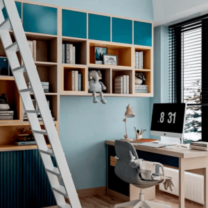 Đối diện với lối vào phòng là tủ quần áo hai cánh, nơi các con có thể treo và gấp quần áo. Lối vào bên phải là một căn gác tạm rộng rãi, nơi các em có thể vui chơi, nghỉ ngơi. Có cầu thang ổn định đặc biệt. Cửa đóng thiết kế hướng vào trong để chơi an toàn nhất.